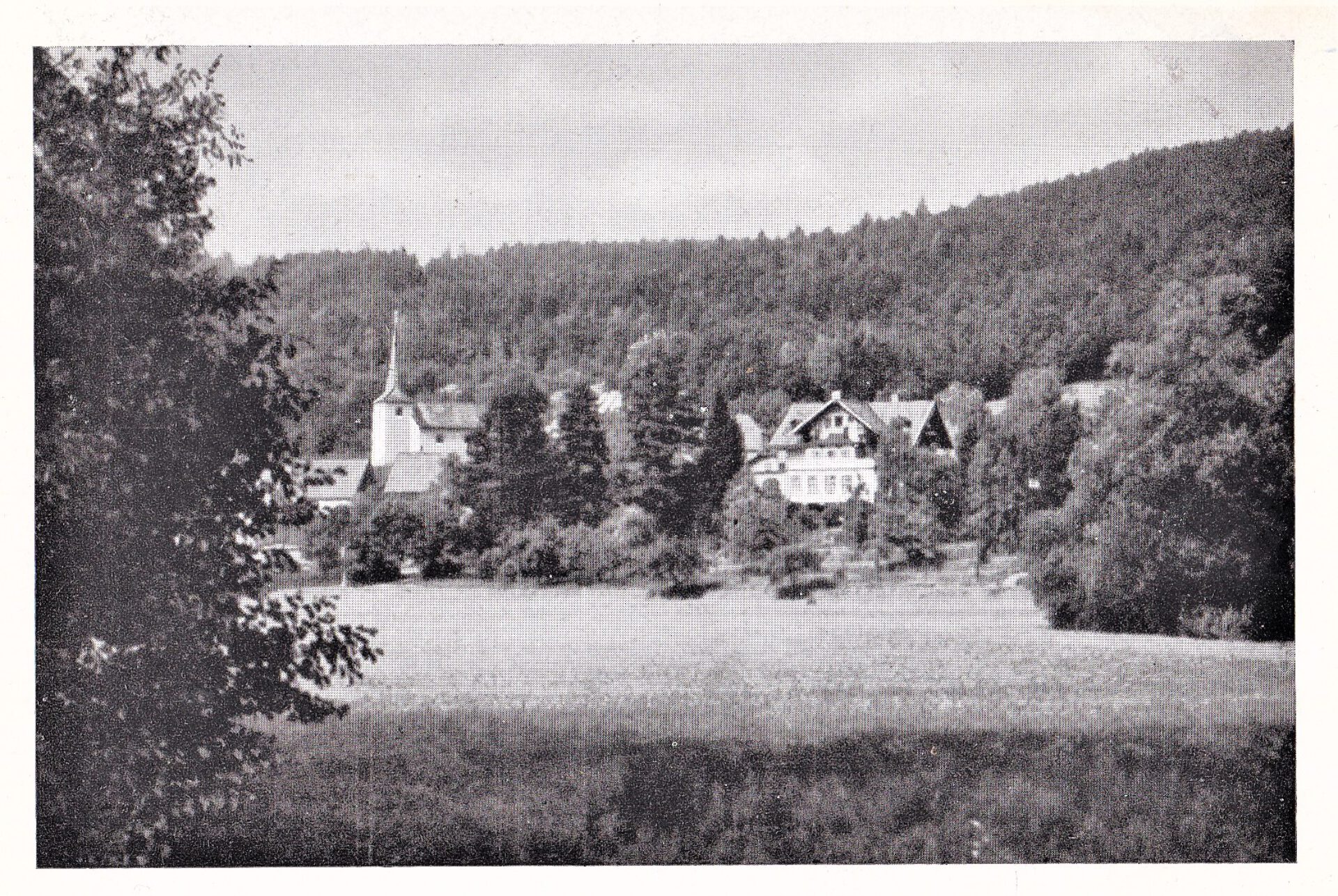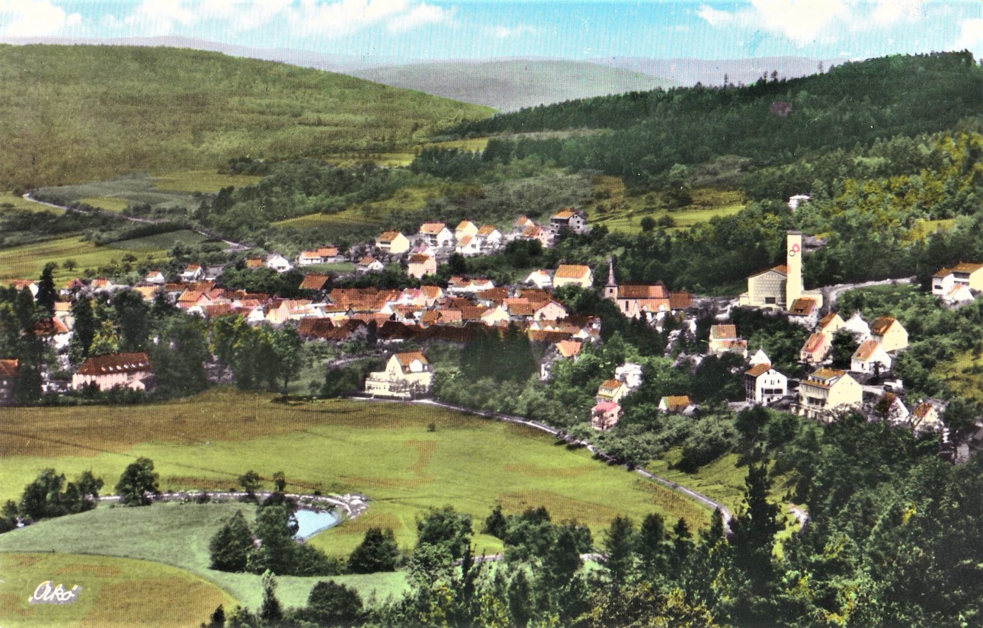 Die letzte Ansichtskarte in dieser Reihe ist noch einmal eine Luftaufnahme. Sie zeigt in den 1970er Jahren neben beiden Kirchen die ehemalige Kurpension Trümbach (unten rechts), zudem das frühere Hotel Kunzmann (unten Mitte).