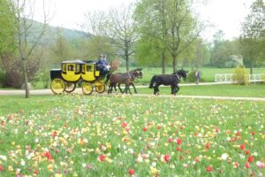 Stilecht startet zu den Trompetenklängen des Postillions der historische gelbe Viergespänner in Bad Kissingen seine Fahrt. Bereits seit 1939 können die Fahrgäste die idyllische Rundfahrt genießen.