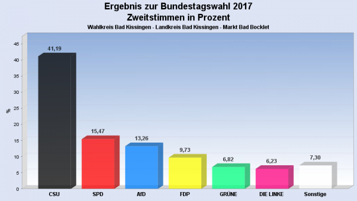 Die meisten Erststimmen gingen im Markt Bad Bocklet mit 1.118 Stimmen (37,57 %) an Frau Bär von der CSU. Frau Dittmar von der SPD erhielt mit 602 Stimmen (20,23 %) und die AfD kam mit 312 Stimmen auf 10,48 %.