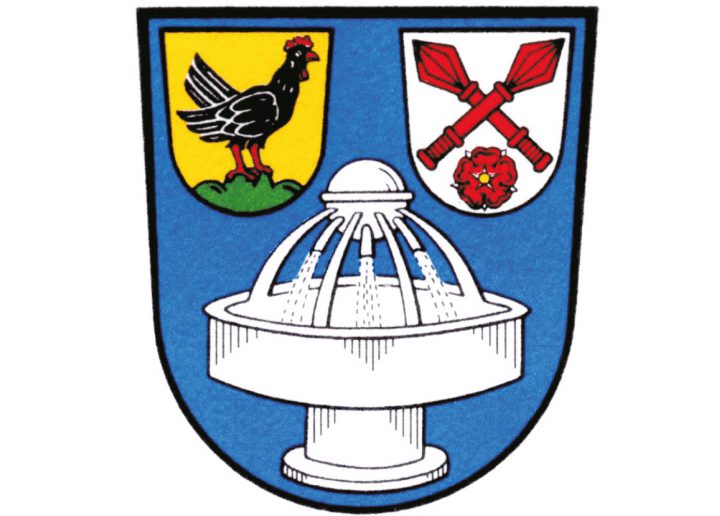 In Blau ein silberner Heilbrunnen, darüber rechts ein goldenes Schildchen, darin auf grünem Dreiberg eine linksgewendete, rot bewehrte schwarze Henne, links ein silbernes Schildchen, darin unter zwei schräg gekreuzten roten Streitkolben eine rote heraldische Rose.