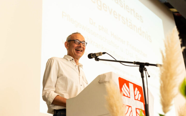 Dass das Hilfehandeln der Pflegenden weit über eine reine Dienstleistung hinausgehe, zeige zum Beispiel die Tatsache, dass es in der Pflege immer um existenzielle Dinge gehe. „Pflege ist eine Arbeit, die Würde schafft“, so der Wissenschaftler. Ein wertbasiertes Verständnis von Pflege müsse die immer zentral im Blick haben. Dies gelte nicht zuletzt für die Ebene der Trägerunternehmen, so Friesacher. Konfessionellen Trägern wie die Caritas attestierte er dabei einen „enormen Vorsprung“. Zugleich gelte auch für sie, dass es nicht nur „Ethik in der Organisation“ bedürfe, also der Festlegung von Wertstandards. Es brauche auch eine „Organisation der Ethik“, um die gewünschten Werte der pflegerischen Arbeit tatsächlich in den Alltag zu integrieren und ihnen damit zum Recht zu verhelfen, erklärte Friesacher im Resümee seines Vortrags.